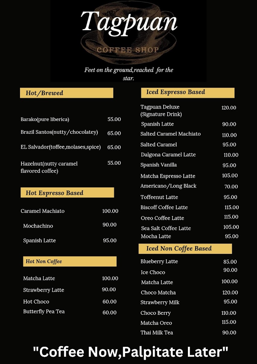 Introducing the menu at Tagpuan Coffee Shop is a delightful experience filled with diverse options that cater to both coffee aficionados and casual snackers alike. Nestled on Kaypiskal Street in Norzagaray, Bulacan, this hidden gem offers an impressive array of coffee choices, each expertly brewed to satisfy your caffeine cravings.